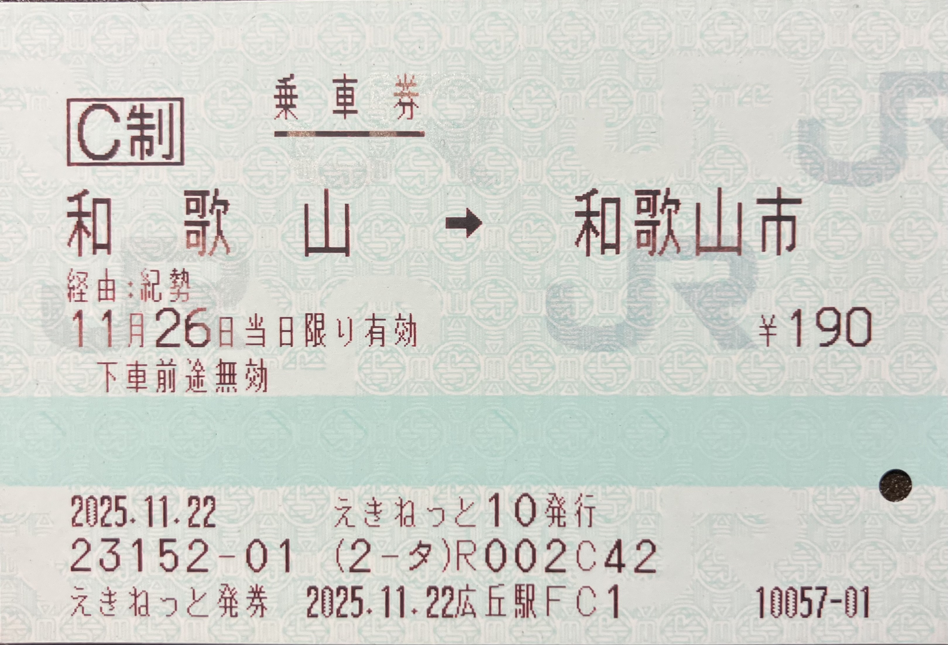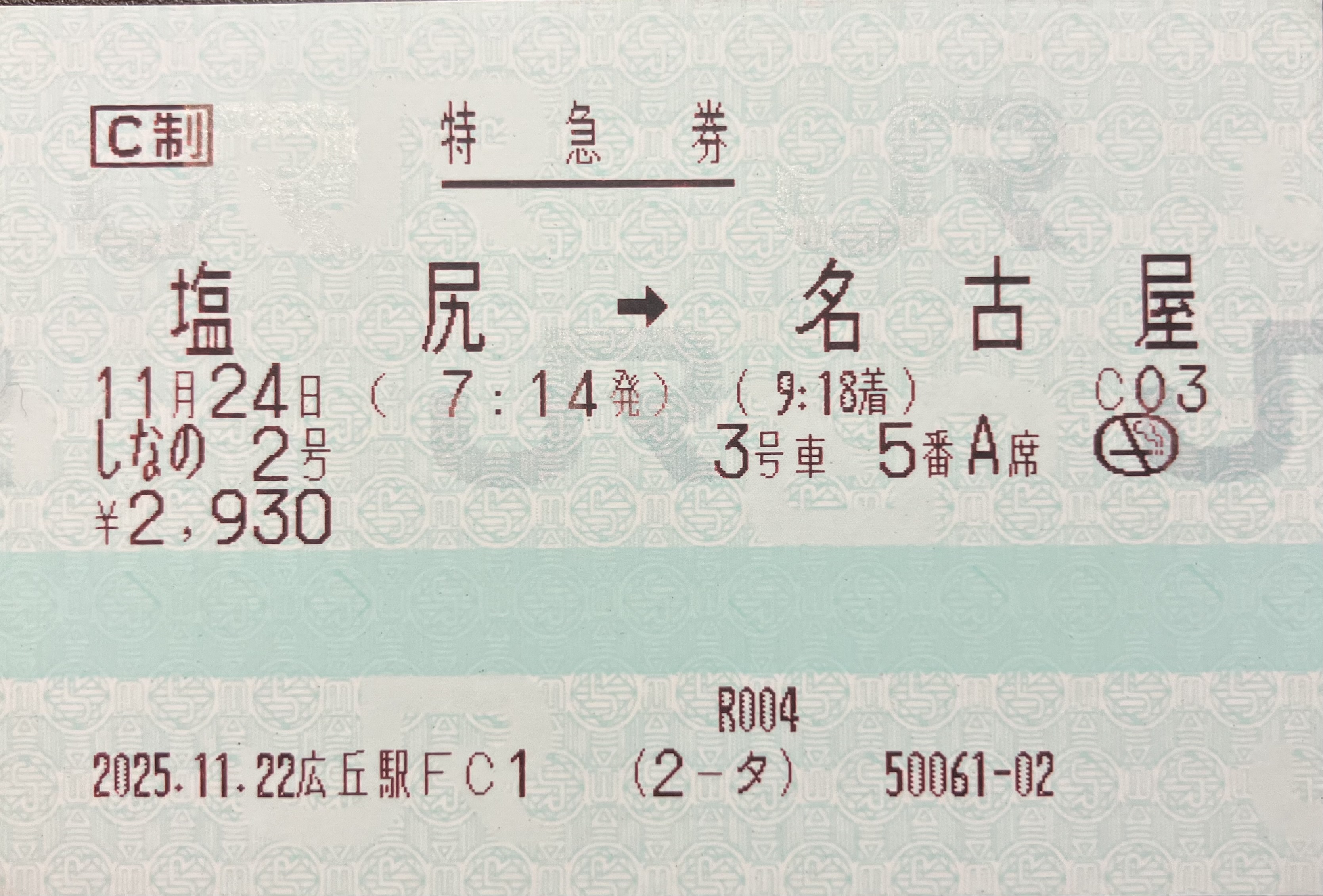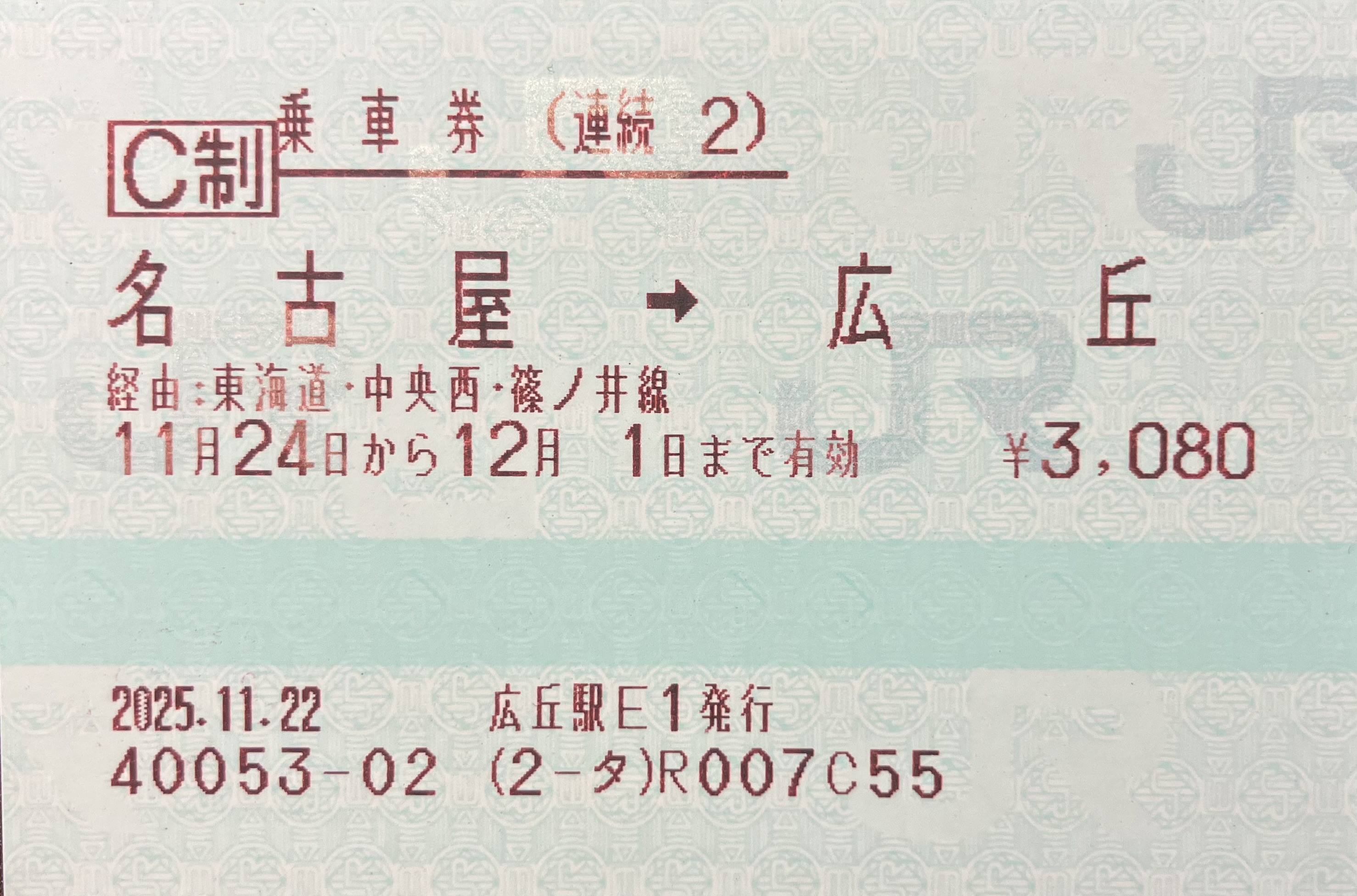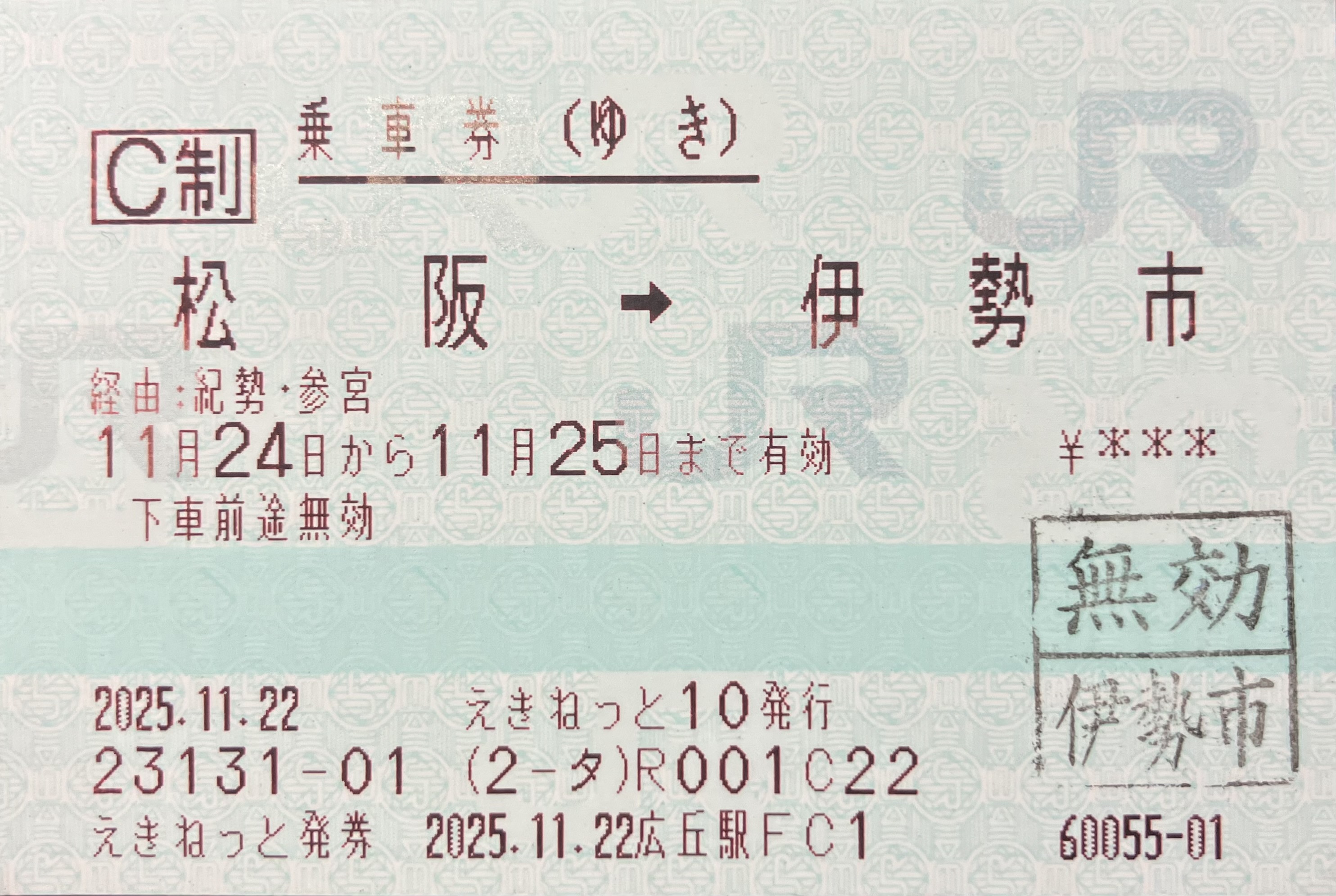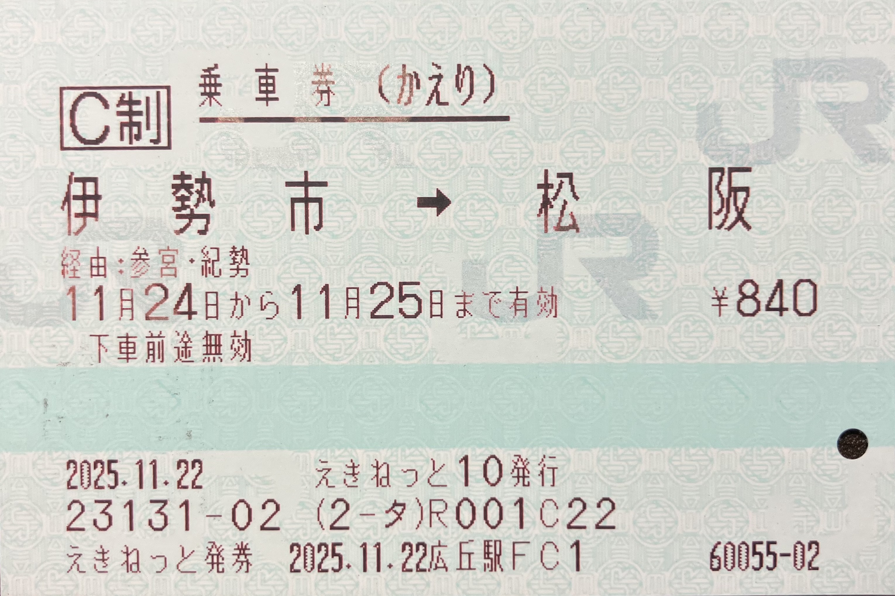 旅行写真 令和7年11月24日-令和7年11月28日 篠ノ井線・中央西線・東海道本線・関西本線・紀勢本線・和歌山線・関西本線・奈良線・東海道新幹線経由乗車券 広丘->名古屋(連続1) 令和7年11月28日 東海道本線・中央西線・篠ノ井線経由乗車券 名古屋->塩尻(連続2) 令和7年11月24日 紀勢本線・参宮線経由乗車券 松阪->伊勢市(往復(ゆき)) 令和7年11月24日 参宮線・紀勢本線経由乗車券 伊勢市->松阪(往復(かえり)) 令和7年11月26日 紀勢本線経由乗車券 和歌山->和歌山市 令和7年11月24日 特急しなの2号指定席特急券 塩尻->名古屋