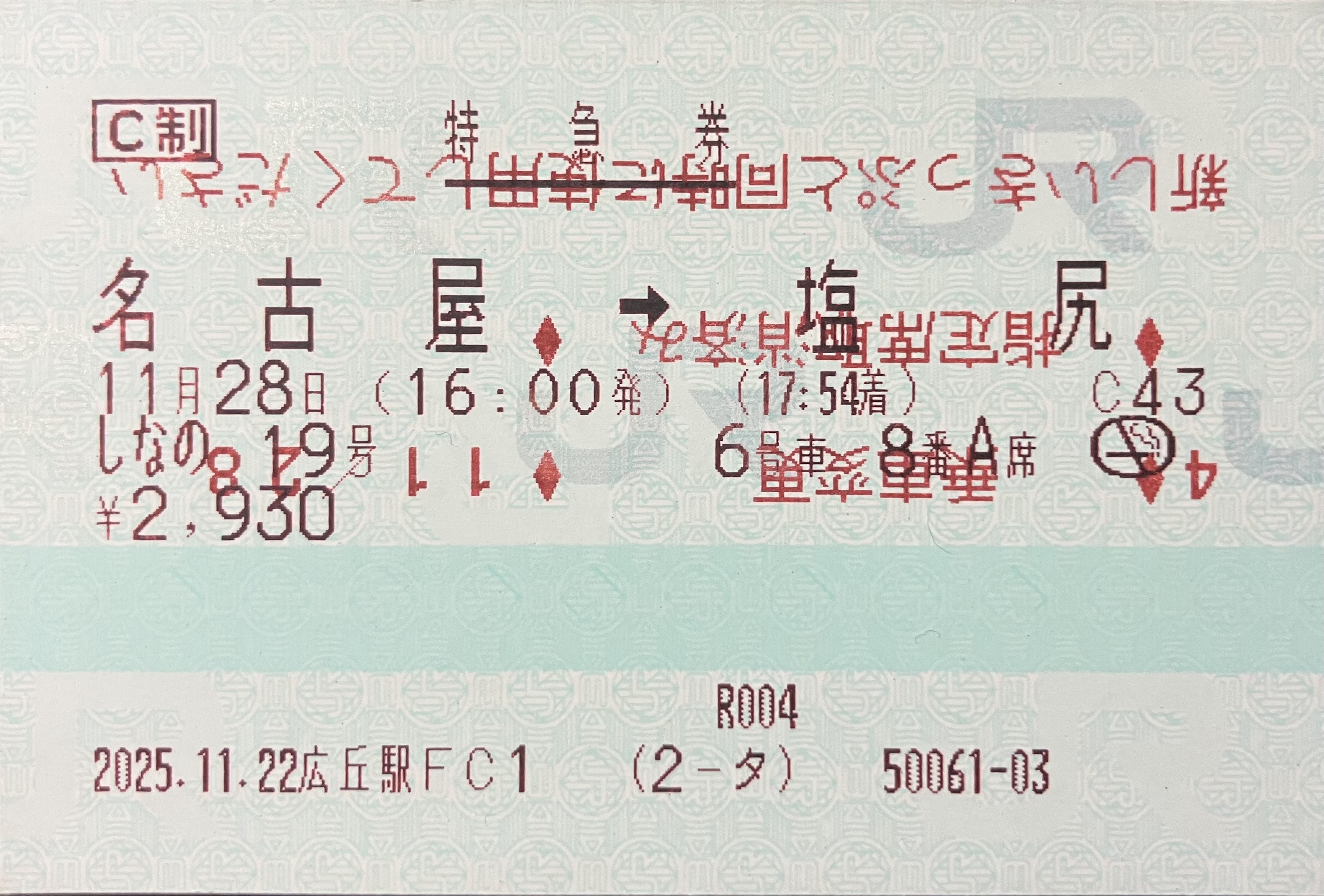 令和7年11月28日 特急しなの17号指定席特急券 名古屋->塩尻