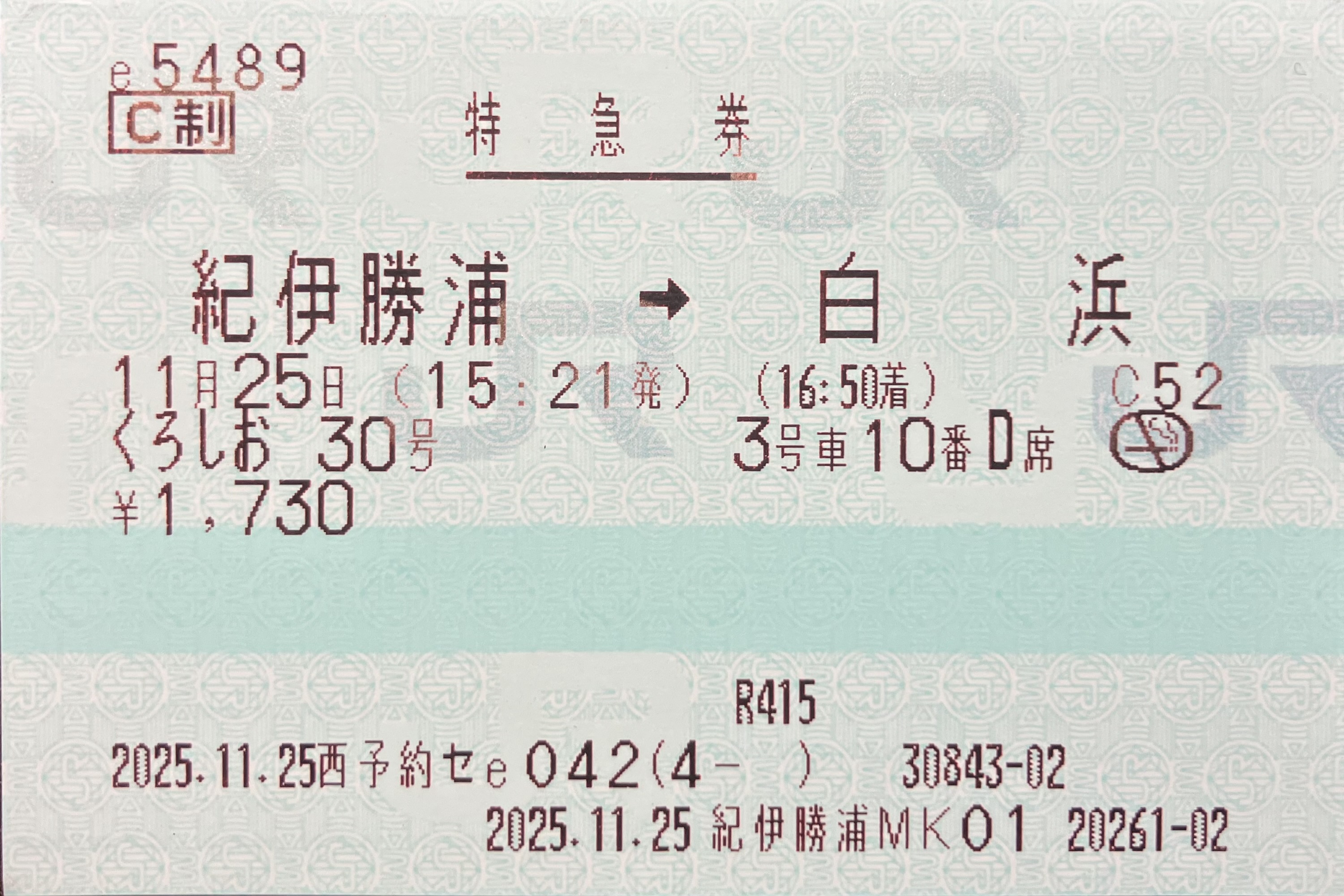 令和7年11月25日 特急くろしお30号指定席特急券 紀伊勝浦->白浜
