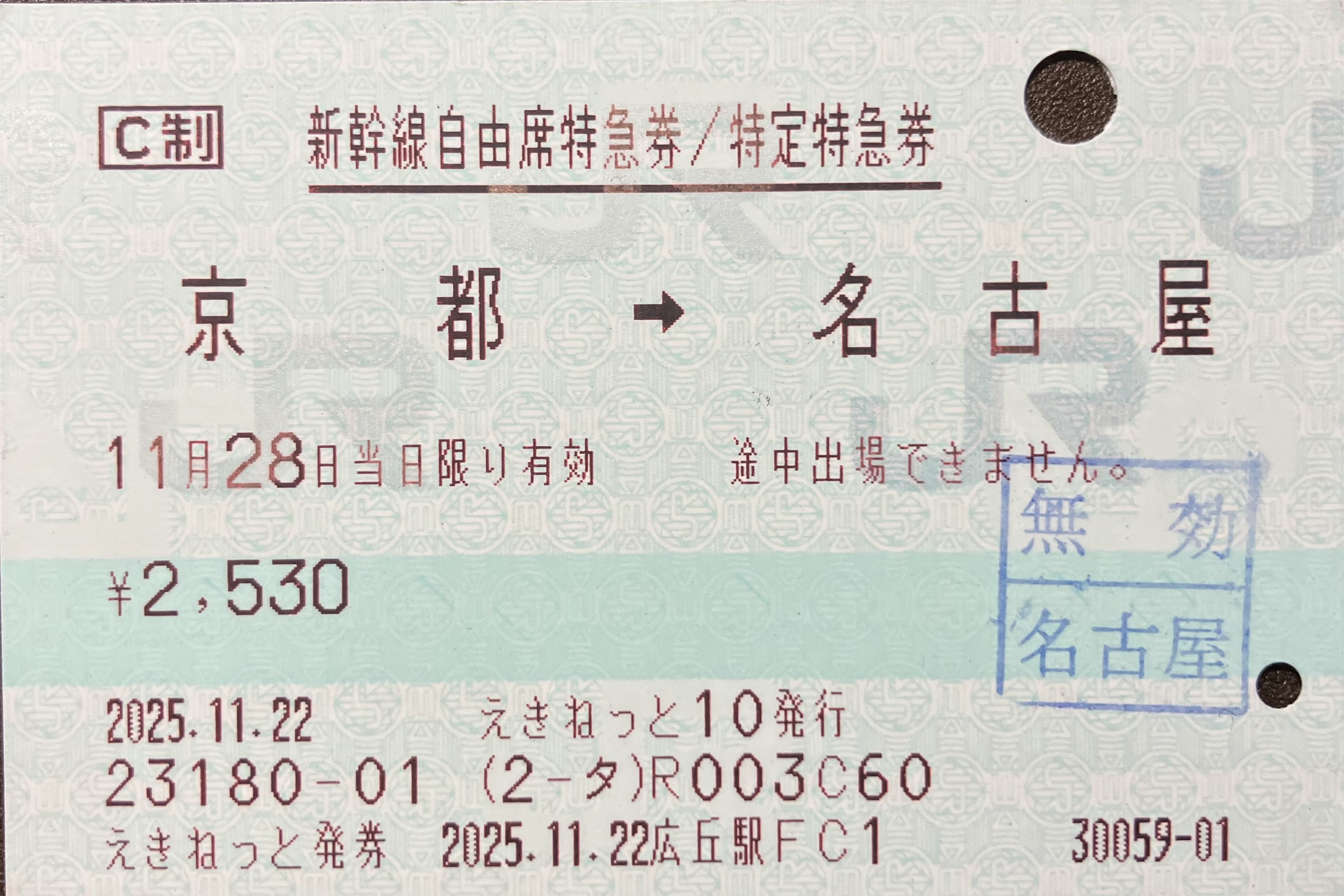 令和7年11月28日 東海道新幹線ひかり510号自由席特急券 京都->名古屋