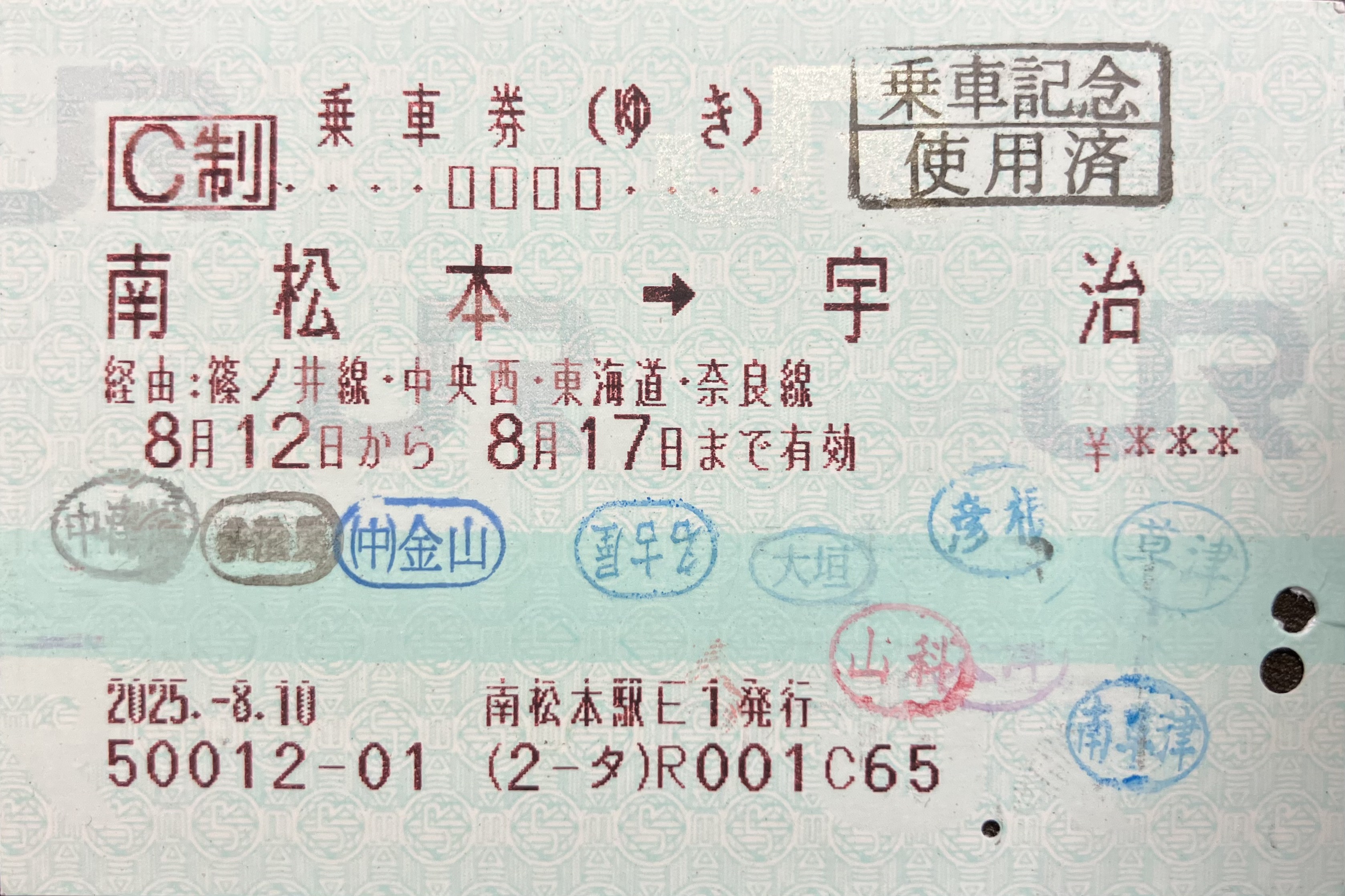 令和7年8月12日-令和7年8月14日 篠ノ井線・中央西線・東海道本線・奈良線経由乗車券 南松本->宇治(往復(ゆき))