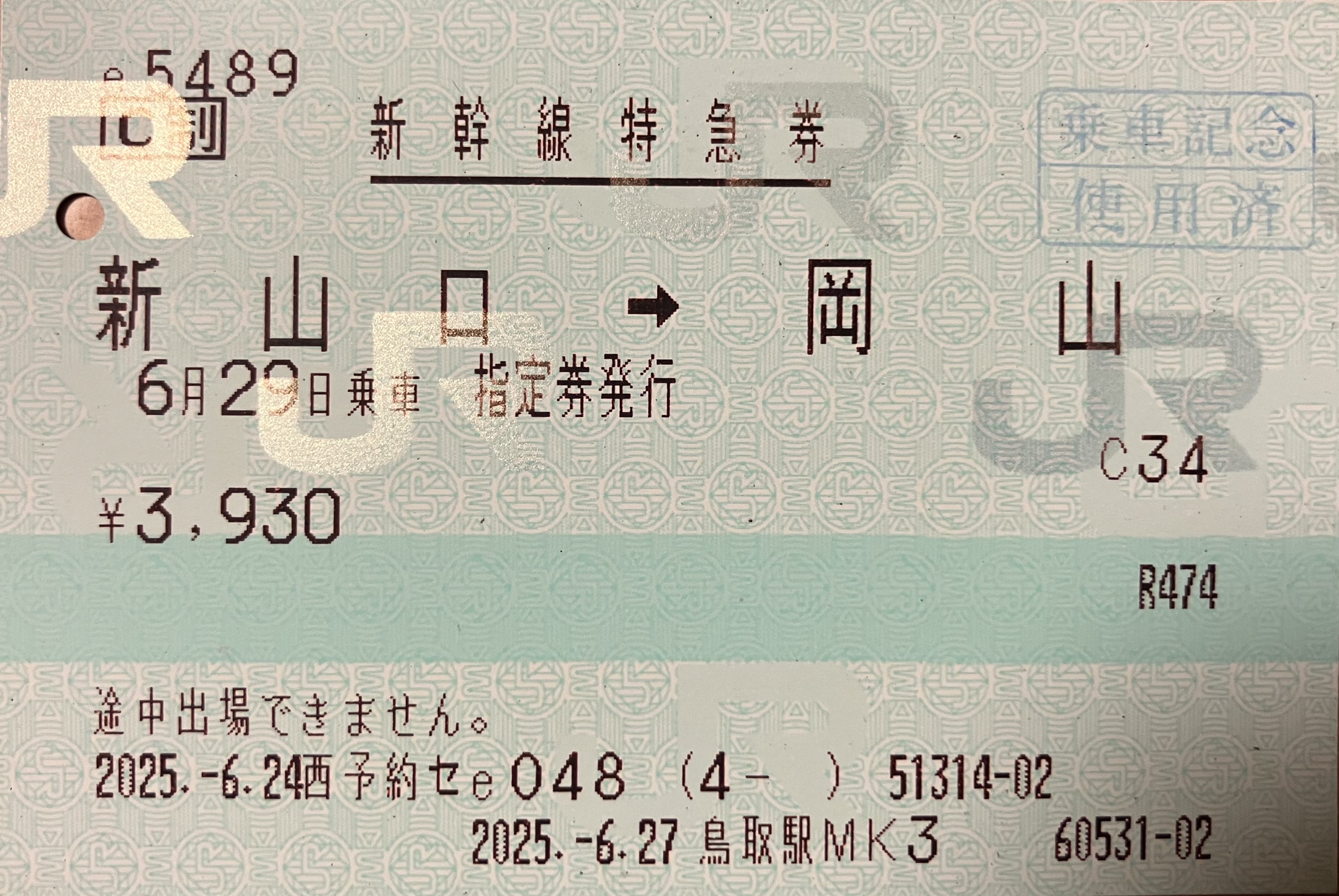 山陽新幹線こだま858号・さくら558号指定席特急券 新山口->岡山