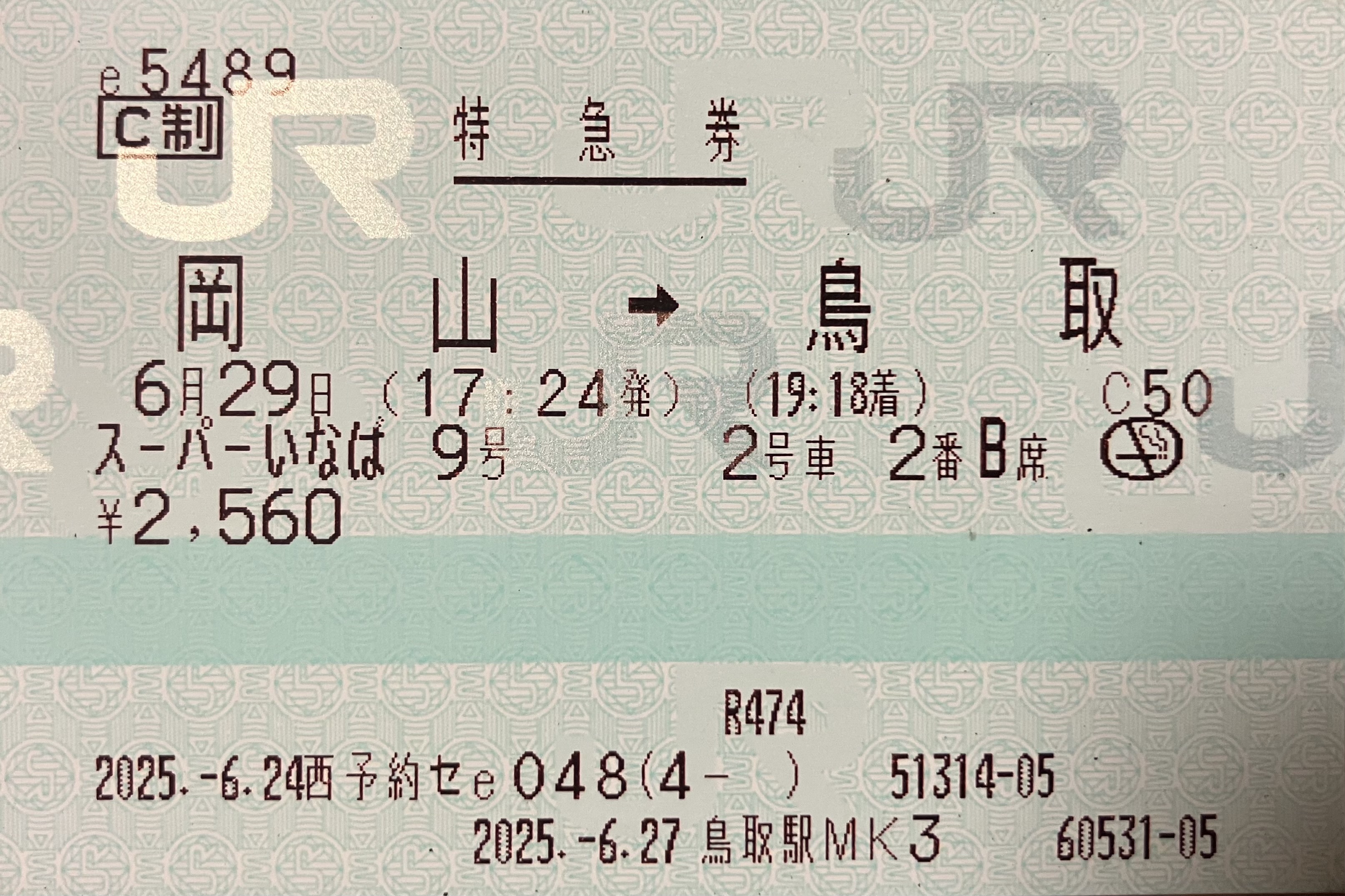 令和7年6月29日 特急スーパーいなば9号指定席特急券 岡山->鳥取