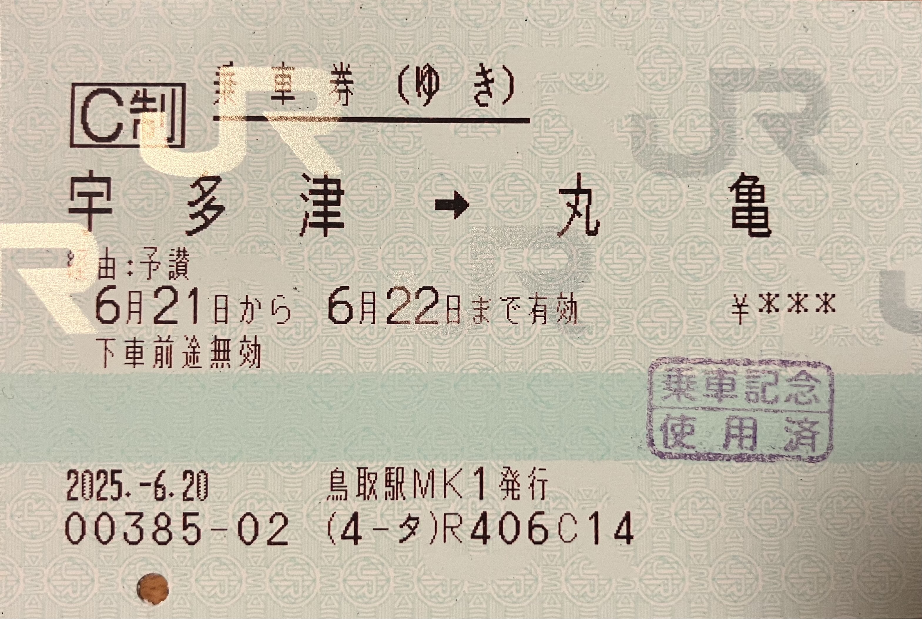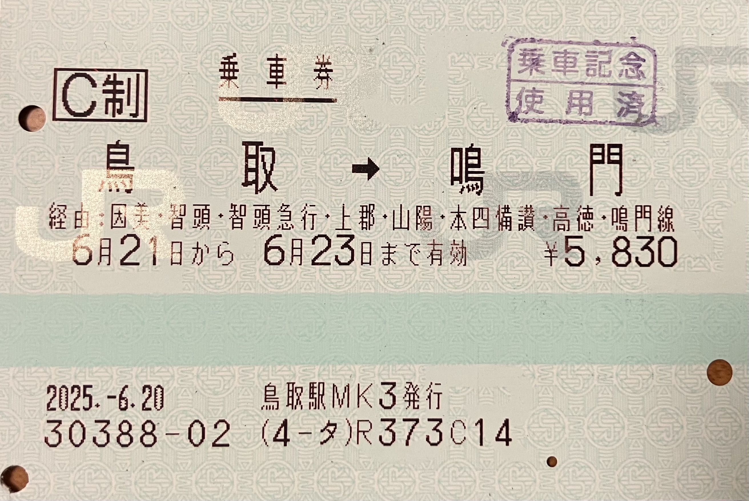 令和7年6月21日 因美線・智頭急行・山陽本線・本四備讃線・予讃線・高徳線・鳴門線経由乗車券 鳥取->鳴門