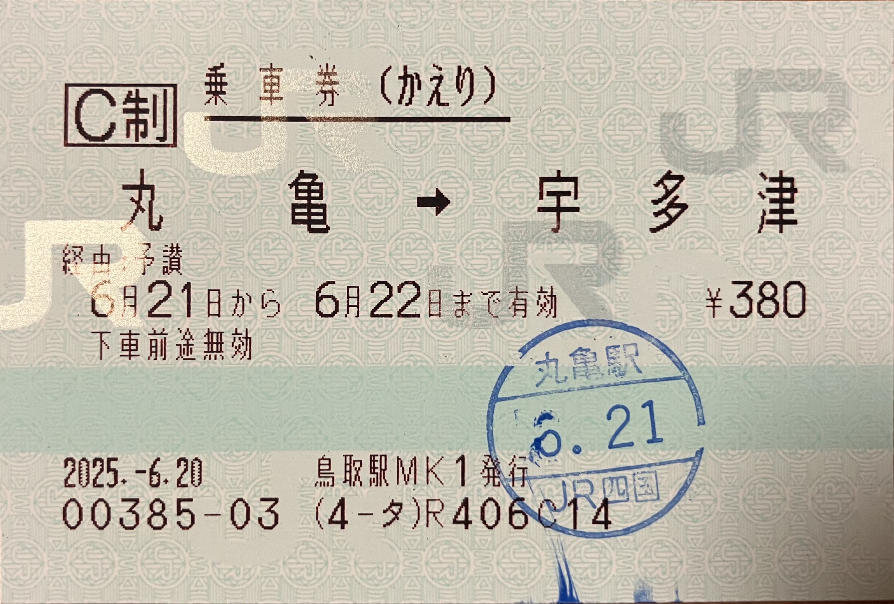 令和7年6月21日 予讃線経由乗車券 丸亀->宇多津(往復(かえり))