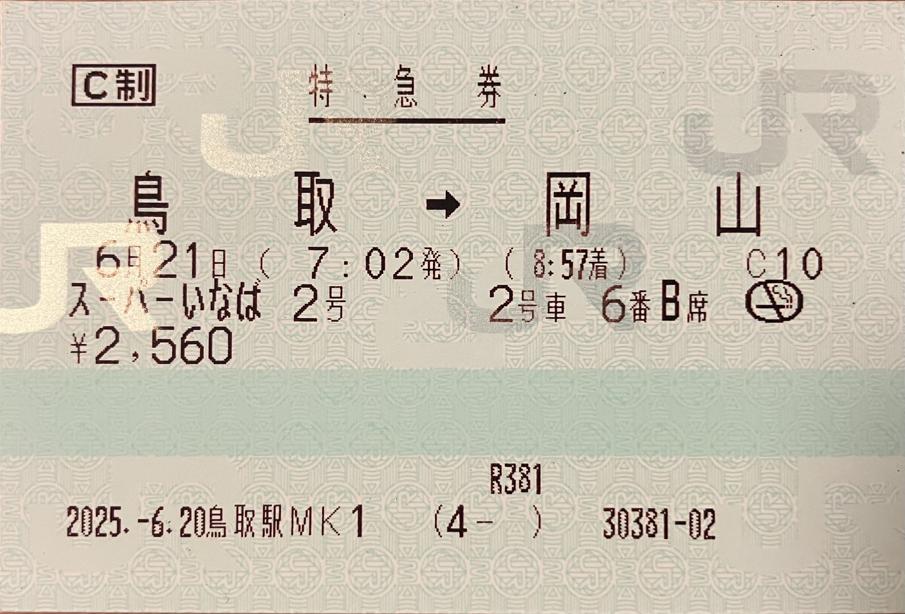 令和7年6月21日 特急スーパーいなば2号指定席特急券 鳥取->岡山