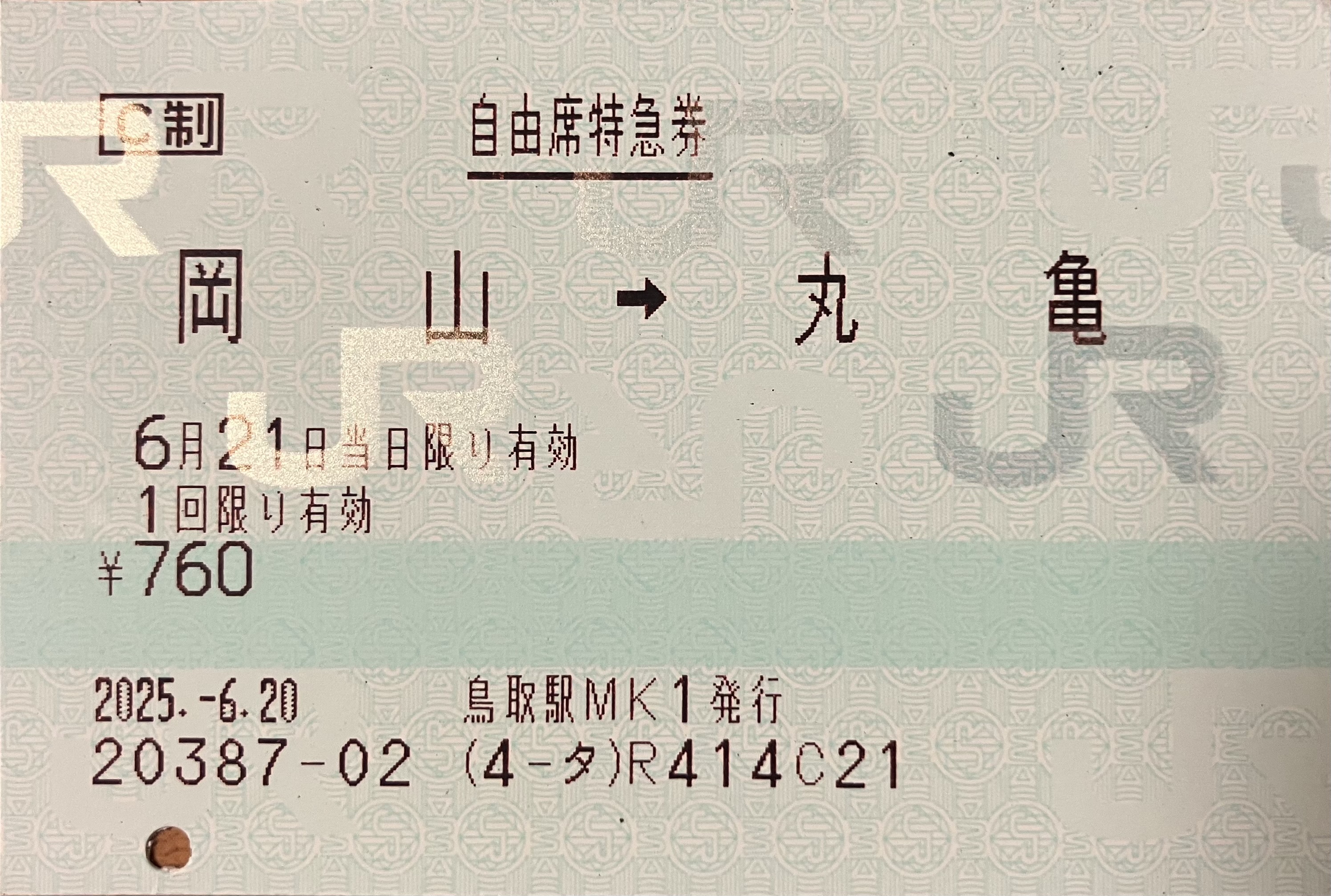 令和7年6月21日 特急しおかぜ5号自由席特急券 岡山->丸亀