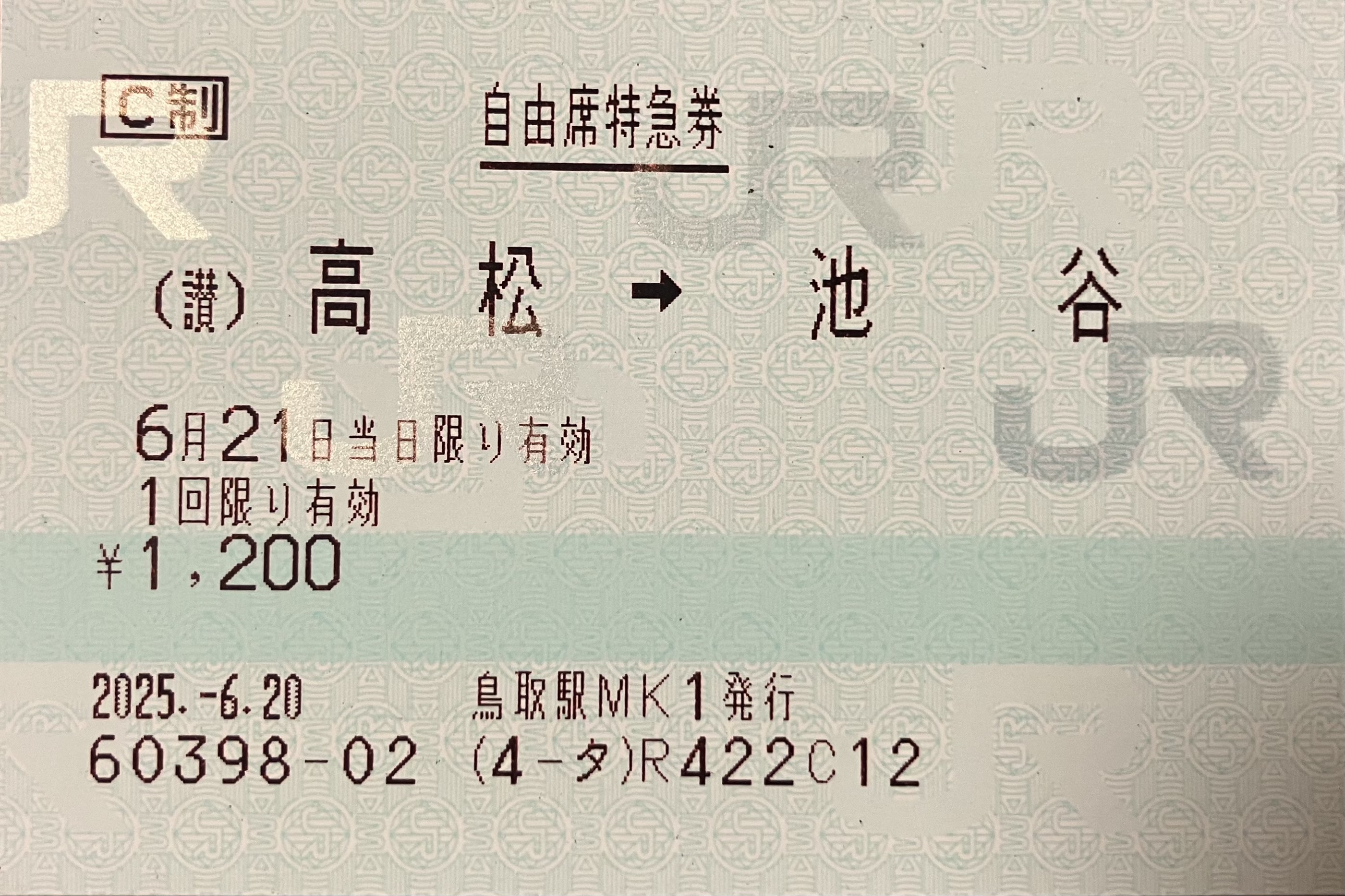 令和7年6月21日 特急うずしお13号自由席特急券 高松->池谷